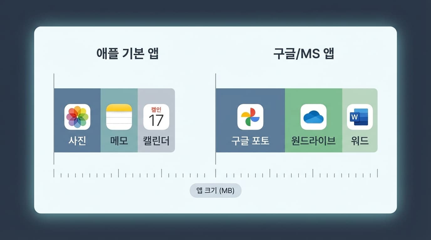 사파리, 캘린더, 메모 등 기본 앱과 서드파티 앱의 용량 차이는 적게는 10배에서 많게는 100배까지 납니다.