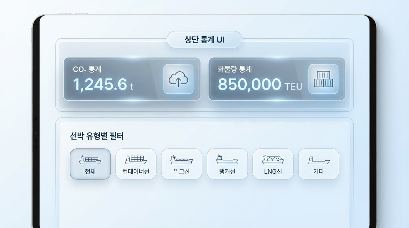 데이터 시각화의 본질은 '예쁜 그림'이 아니라 '정보의 구조화'에 있습니다. Shipmap은 컨테이너선, 건화물선(Dry bulk), 유조선(Tanker), 가스선, 자동차 운반선 등 5가지 카테고리로 선박을 분류하고 필터링 기능을 제공합니다. 여기서 중요한 건 단순히 배의 위치만 보여주는 것이 아니라, 각 선박 유형에 맞는 핵심 지표(Key Metrics)를 산출했다는 점입니다. 컨테이너선은 슬롯 수, 가스선은 입방미터(m³), 벌크선은 톤수(kt)로 단위를 구분하여 상단에 실시간 카운터로 보여줍니다. 또한, 단순히 이동 경로만 보여주는 데 그치지 않고, IMO(국제해사기구) 연구 방식을 적용해 CO2 배출량을 계산하여 시각화했습니다. 이는 데이터를 단순 나열하는 것을 넘어, "이 물동량이 환경에 어떤 영향을 미치는가?"라는 비즈니스적 질문에 대한 답을 데이터로 제시하는 훌륭한 레퍼런스입니다. 기획자라면 "무엇을 보여줄까?"가 아니라 "어떤 문제를 해결할 지표인가?"를 먼저 고민해야 합니다.