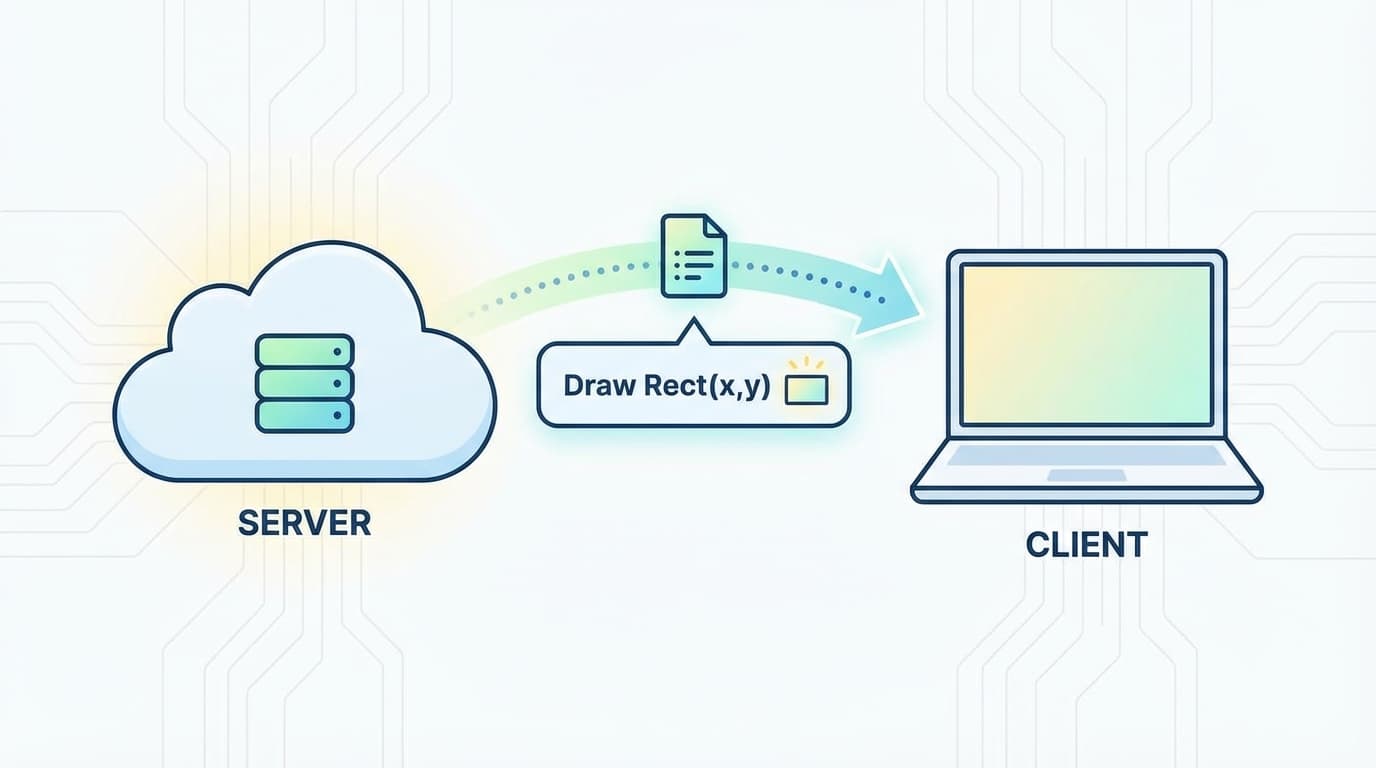 쉽게 말해서, 서버가 "여기 빨간 네모 그려, 저기 파란 원 그려, 텍스트는 이거 써"라는 명령어(Draw Command)만 WebRTC로 쏘는 겁니다.