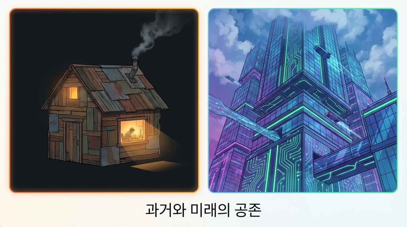 개발자로서 우리가 겪는 또 다른 비극은 '도구의 늪'에 빠져 있다는 점입니다. 8년 전, 저는 index.html 하나만으로도 세상을 놀라게 할 수 있다고 믿었습니다. 하지만 지금 우리의 현실은 어떻습니까? 웹사이트 하나를 띄우기 위해 준비해야 할 목록을 떠올려 보십시오. Docker, Kubernetes, CI/CD 파이프라인, Webpack 설정, ESLint, Prettier, 수많은 테스팅 프레임워크들... 기사 속 표현처럼 우리는 "어떤 공포가 기다리는지 모른 채" 무기만 잔뜩 챙기는 꼴입니다. 최근 사내 프로젝트에서 배포 파이프라인 최적화에만 2주를 쏟아부은 적이 있습니다. 정작 그 서비스가 전달해야 할 핵심 가치는 뒷전이었죠. 도구는 화려해졌지만, 정작 우리가 만드는 웹 공간은 점점 더 획일화되고, 사용자의 온기가 느껴지는 '손때 묻은' 공간은 사라지고 있습니다.