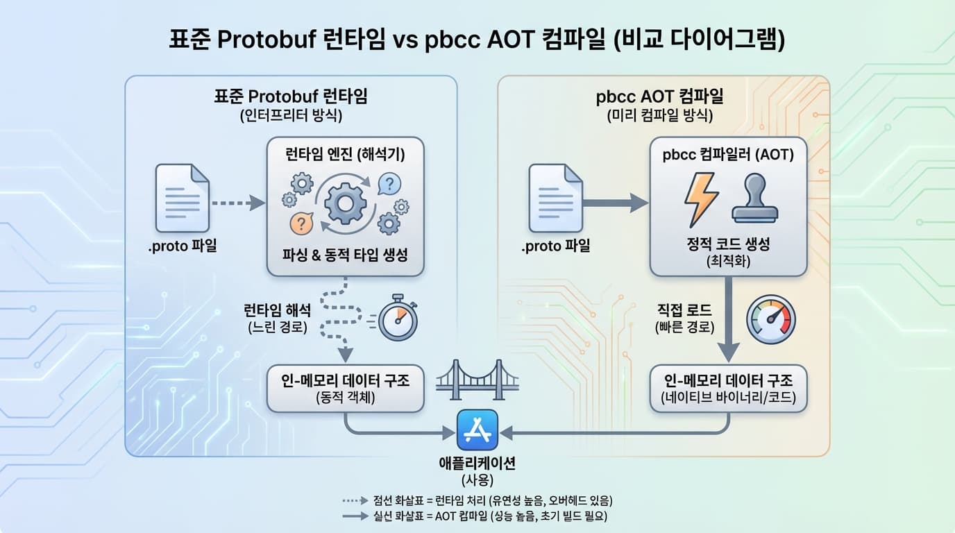 이 문제를 해결하기 위해 Harmonic 팀이 선택한 방식은 런타임 해석이 아닌 AOT(Ahead-of-Time) 컴파일입니다. pbcc라는 이름의 이 컴파일러는 .proto 파일을 읽어서 런타임에 해석하는 대신, 아예 최적화된 C++ 코드를 생성해버립니다. 그리고 이를 Python 확장 모듈(.so)로 빌드하여 Python이 마치 C++ 객체를 다루듯 직접 import하게 만듭니다. 중간 단계의 해석 비용을 제거하고, 직렬화/역직렬화 로직을 기계어 레벨로 내려버린 것입니다. 이는 제가 삼성전자 시절 펌웨어 레벨에서 비트를 깎아가며 최적화하던 방식과 맥락을 같이합니다. 불필요한 추상화 레이어를 걷어내는 것이 성능 최적화의 첫걸음입니다.