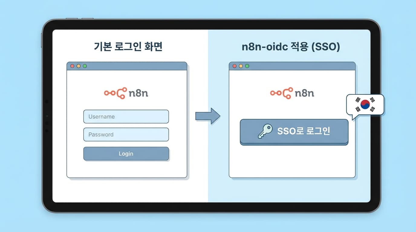 다행히도 개발자들의 집요함은 언제나 해결책을 찾아냅니다. 최근 공개된 n8n-oidc는 이러한 부당한 과금 모델에 대한 완벽한 기술적 반격입니다. 이 솔루션은 복잡한 포크(Fork)나 코어 코드 수정 없이, n8n이 공식적으로 지원하는 외부 훅(External Hooks) 시스템만을 활용하여 OIDC(OpenID Connect) 인증을 구현해냈습니다. 작동 원리는 매우 논리적이고 깔끔합니다. hooks.js 파일 하나가 런타임에 개입하여 로그인 라우트를 가로채고, 사용자를 우리가 설정한 아이덴티티 제공자(Keycloak, PocketID 등)로 리다이렉트 시킵니다.