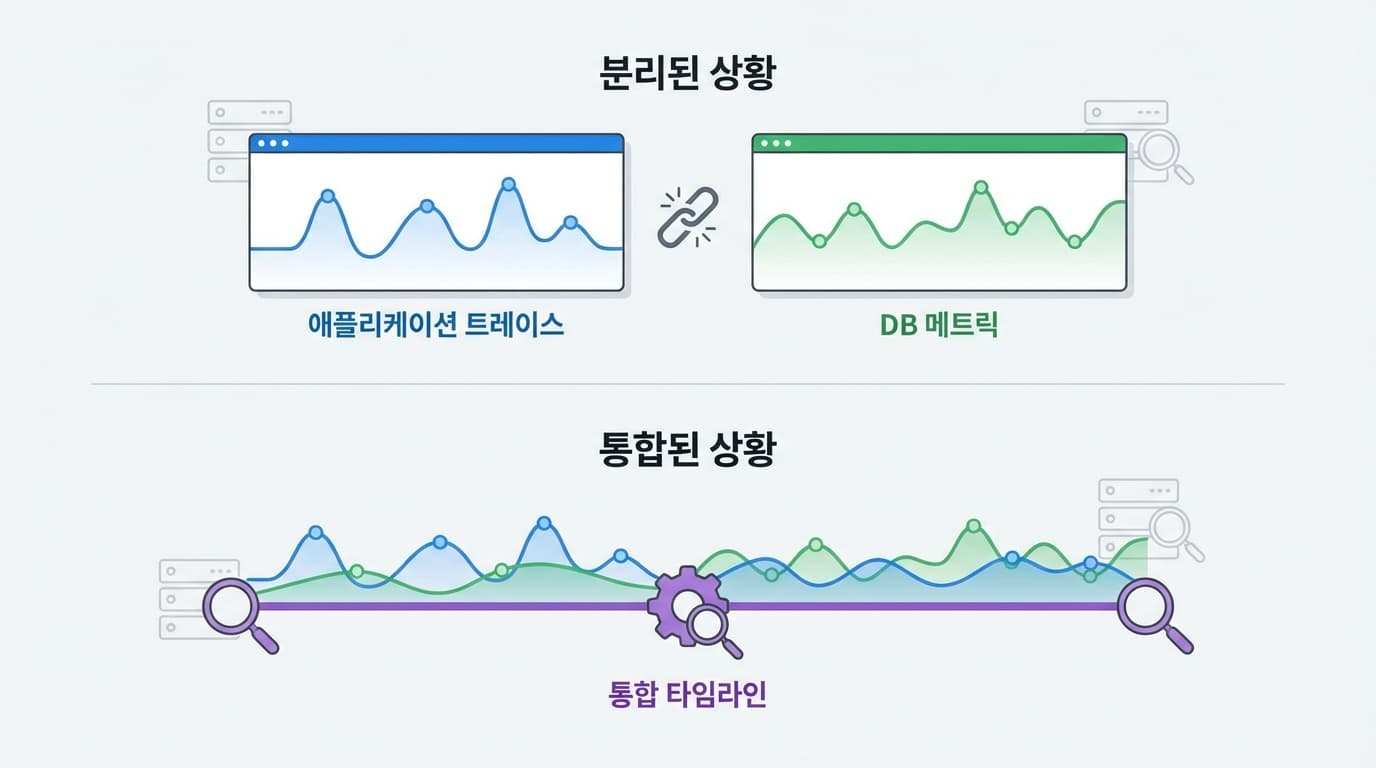 실리콘밸리에서 Staff SRE로 일하며 수없이 겪은 패턴입니다. 우리는 흔히 애플리케이션은 APM(Application Performance Monitoring)으로, 데이터베이스는 AWS RDS 콘솔이나 별도의 전문 도구로 모니터링합니다. 트래픽이 적을 땐 이 방식도 통합니다. 사람이 눈으로 대시보드 두 개를 번갈아 보며 타임스탬프를 맞추면 되니까요. 하지만 트래픽이 초당 수만 건을 넘어가고 마이크로서비스(MSA)가 복잡하게 얽히기 시작하면 이 '분리된 관측'은 재앙이 됩니다.
