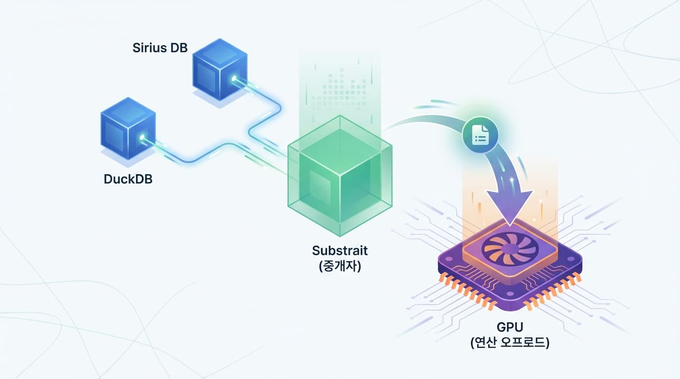 이게 어떻게 가능할까요? 핵심은 'Substrait'이라는 표준 쿼리 포맷에 있습니다. Substrait은 서로 다른 데이터 시스템끼리 쿼리 계획을 주고받을 수 있게 해주는 공용 언어 같은 역할을 합니다. 덕분에 우리는 익숙한 DuckDB 환경에서 SQL을 날리지만, 뒤단에서는 Sirius가 이 쿼리를 가로채서 GPU로 처리해 버리는 구조죠. 마치 오래된 자동차 엔진에 최신형 터보차저를 장착하는 것과 비슷하다고 볼 수 있습니다.