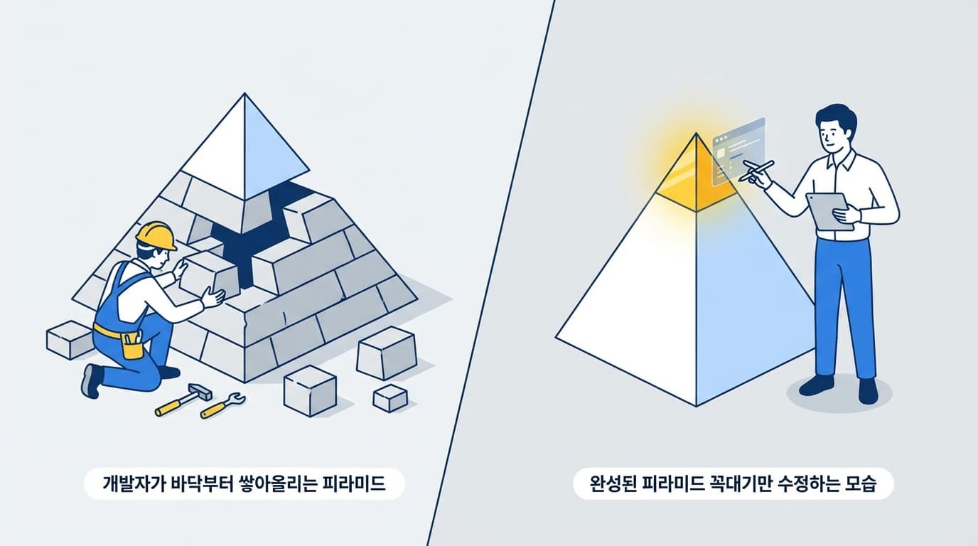 결국 우리는 여전히 'Bottom-up(상향식)'으로 일하고 있습니다. DB 깔고, API 짜고, 프런트 붙이고... 하나하나 쌓아 올립니다.