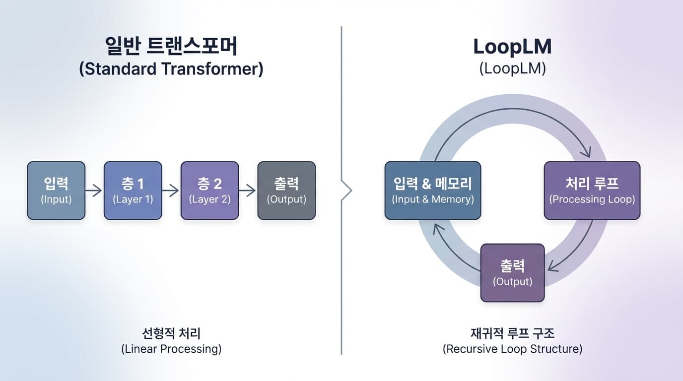 우리가 흔히 쓰는 트랜스포머 기반의 LLM은 기본적으로 '다음 단어 예측' 기계입니다. 깊이(Depth)가 고정되어 있고, 입력이 들어가면 정해진 레이어를 통과해 출력이 나옵니다. 반면, 이번에 제안된 LoopLM(Looped Language Models)은 이름처럼 계산 과정을 '루프' 시킵니다. 즉, 다음 토큰을 뱉기 전에 잠재 공간 안에서 데이터를 반복적으로 되새김질하며 연산합니다. 중요한 것은 이 과정이 사전 학습(Pre-training) 단계에 내장되어 있다는 점입니다. 기존 CoT가 학습이 끝난 모델을 어르고 달래서 추론을 '흉내' 내게 했다면, LoopLM은 태생부터 '생각하는 법'을 훈련받은 셈입니다.