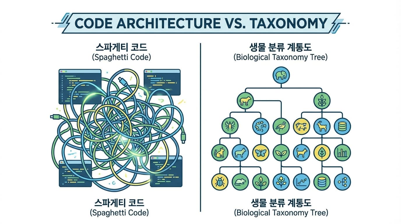 결국 AI 시대에 우리가 살아남는 방법은 코드를 더 빨리 짜거나, 화면을 더 예쁘게 그리는 게 아닙니다. 그건 이미 AI가 우리보다 잘합니다. 우리가 해야 할 일은 ADW가 보여준 것처럼 혼란스러운 정보(Chaos)에 질서(Order)를 부여하는 것입니다. AI에게 "동물 정보를 줘"라고 하는 것과, "척삭동물문 포유강 식육목에 속하는 동물 중 북미에 서식하는 종의 데이터를 JSON으로 줘"라고 하는 것은 천지 차이입니다. 후자의 질문을 던질 수 있으려면, 그리고 그 결과를 검증하려면 우리 머릿속에 명확한 '분류 체계(Taxonomy)'가 있어야 합니다.