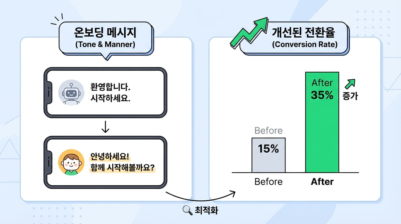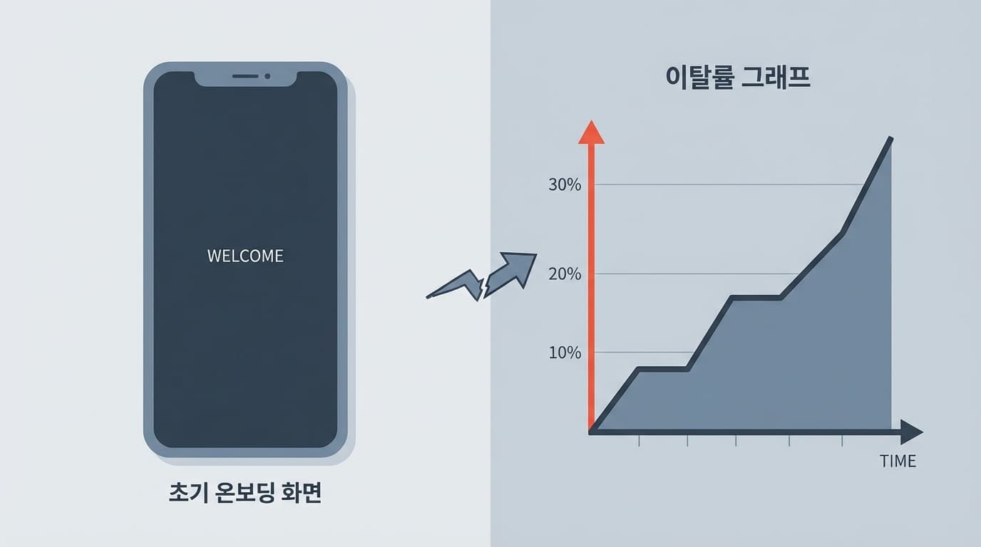 결과는 처참했습니다. 앱 실행 후 첫 화면에서의 이탈률이 40%를 기록했습니다. 사용자는 우리의 화려한 UI를 보기도 전에, 아무런 감흥 없는 기계적인 인사에 질려 뒤로 가기 버튼을 눌렀던 것입니다.
